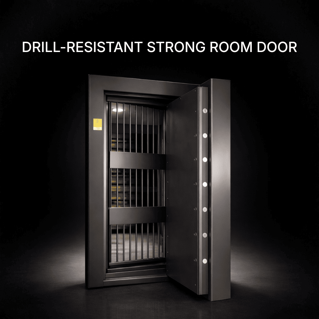 A fire-proof, drill-resistant strong room door engineered for high-security vault installations. Built with reinforced steel construction, it delivers strong protection against drilling, forced entry, and fire threats in banking and institutional environments.