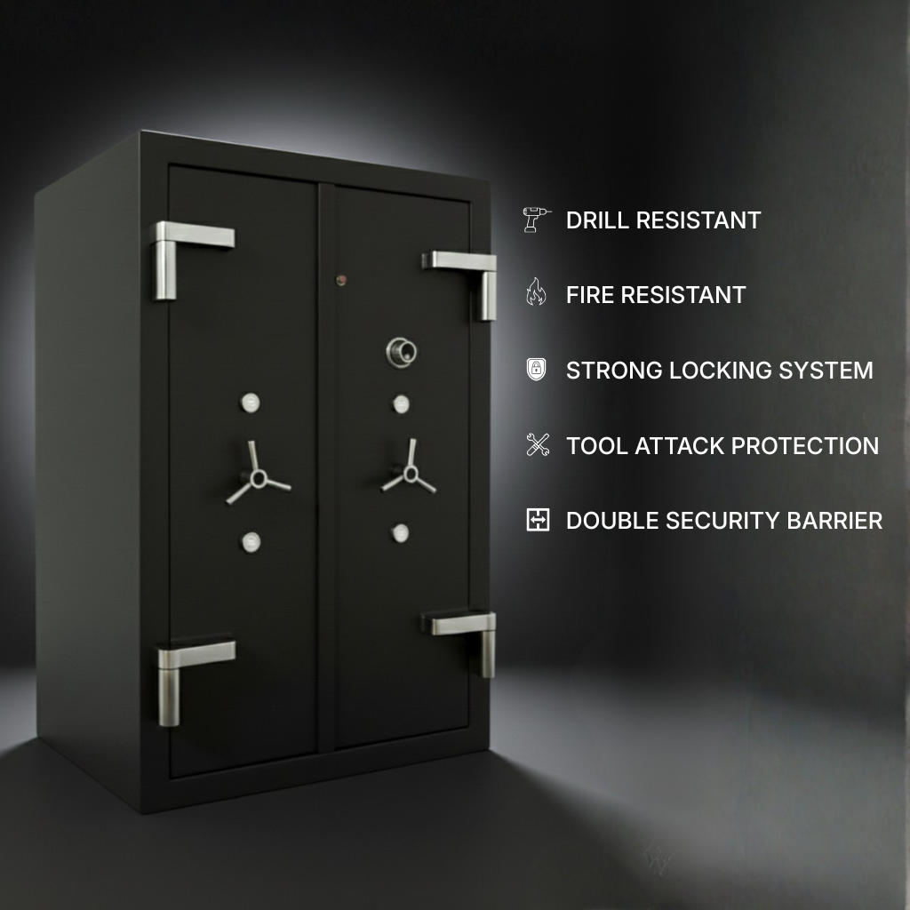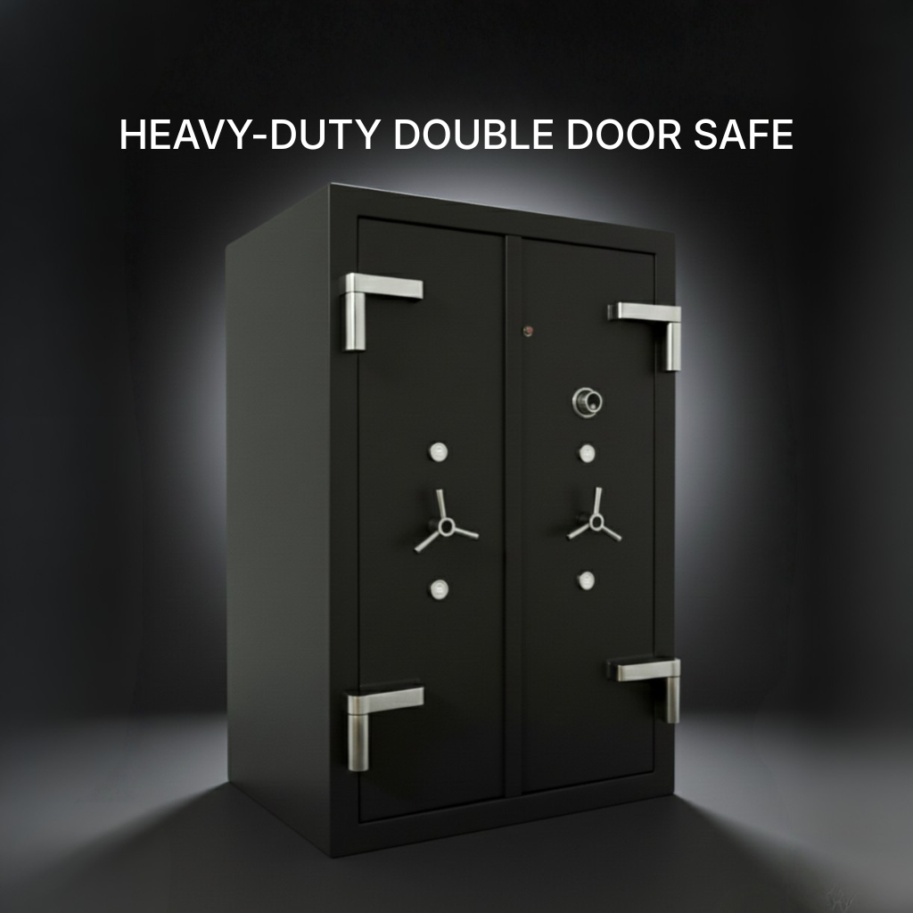 A fire-proof heavy-duty double door safe engineered for maximum security and long-term protection of high-value assets. Built with industrial-grade materials, it offers superior resistance to fire, theft, and forced entry, along with organized storage using shelves and drawers.